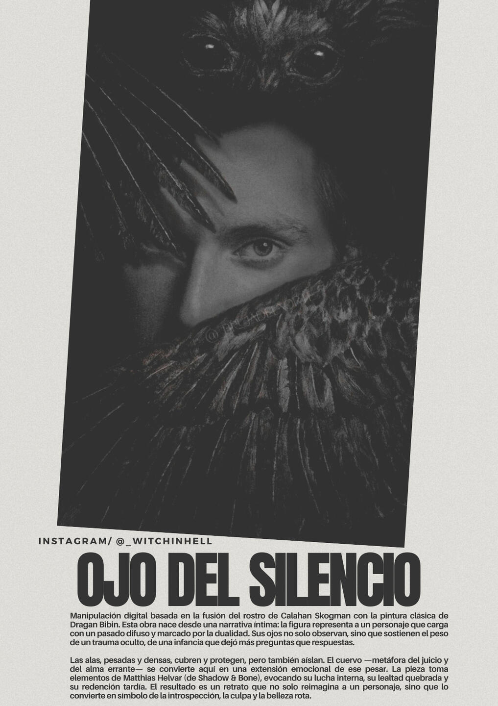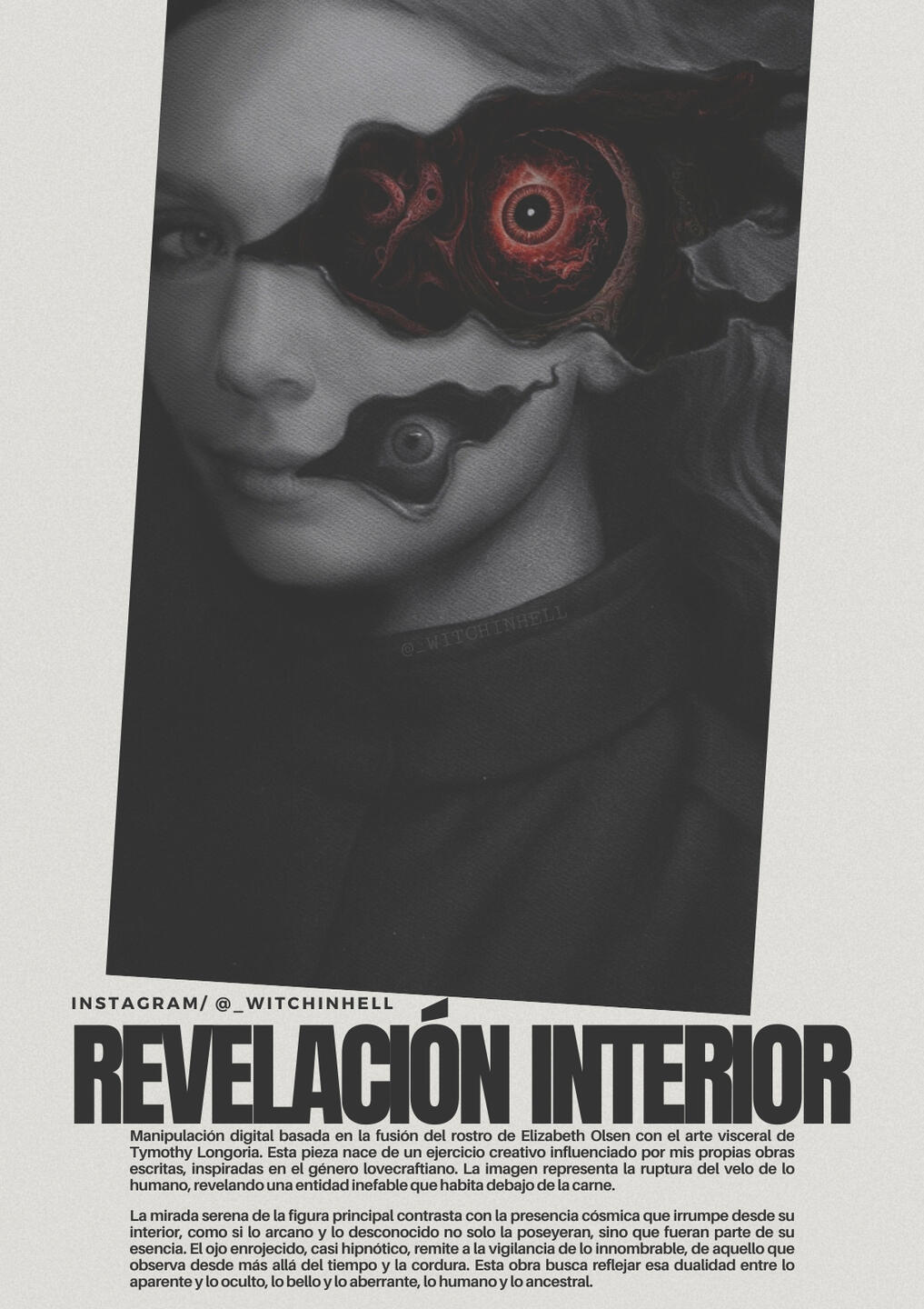 La manipulación digital es una forma de arte visual que transforma fotografías comunes en composiciones fantásticas, oscuras o surrealistas mediante herramientas de edición como Photoshop. En este proceso, la imagen original se altera, se fusiona con otros elementos gráficos y se llena de atmósfera, color y simbolismo, dando lugar a escenas que parecen sacadas de un sueño (o una pesadilla).En el caso de mi trabajo, la manipulación digital no es solo una técnica: es una forma de contar historias visuales inspiradas en el ocultismo, el horror estético, lo místico y lo alternativo. Cada pieza es una exploración de mundos internos, arquetipos oscuros y emociones intensas. Uso recursos como texturas, overlays, efectos glitch, tipografías vintage y símbolos arcanos para lograr una estética única, muchas veces inspirada en el universo lovecraftiano y el imaginario roleplayer.