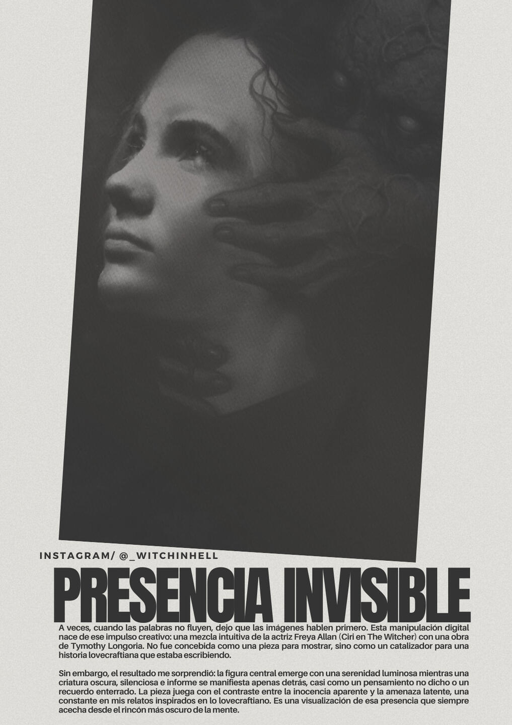 Soy creadora visual, escritora de mundos rotos, exploradora de lo oculto. Mi trabajo gira en torno al terror cósmico, la manipulación digital, el diseño gráfico y la narrativa emocional. Aquí recojo mis obsesiones y las transformo en recursos, imágenes y palabras.